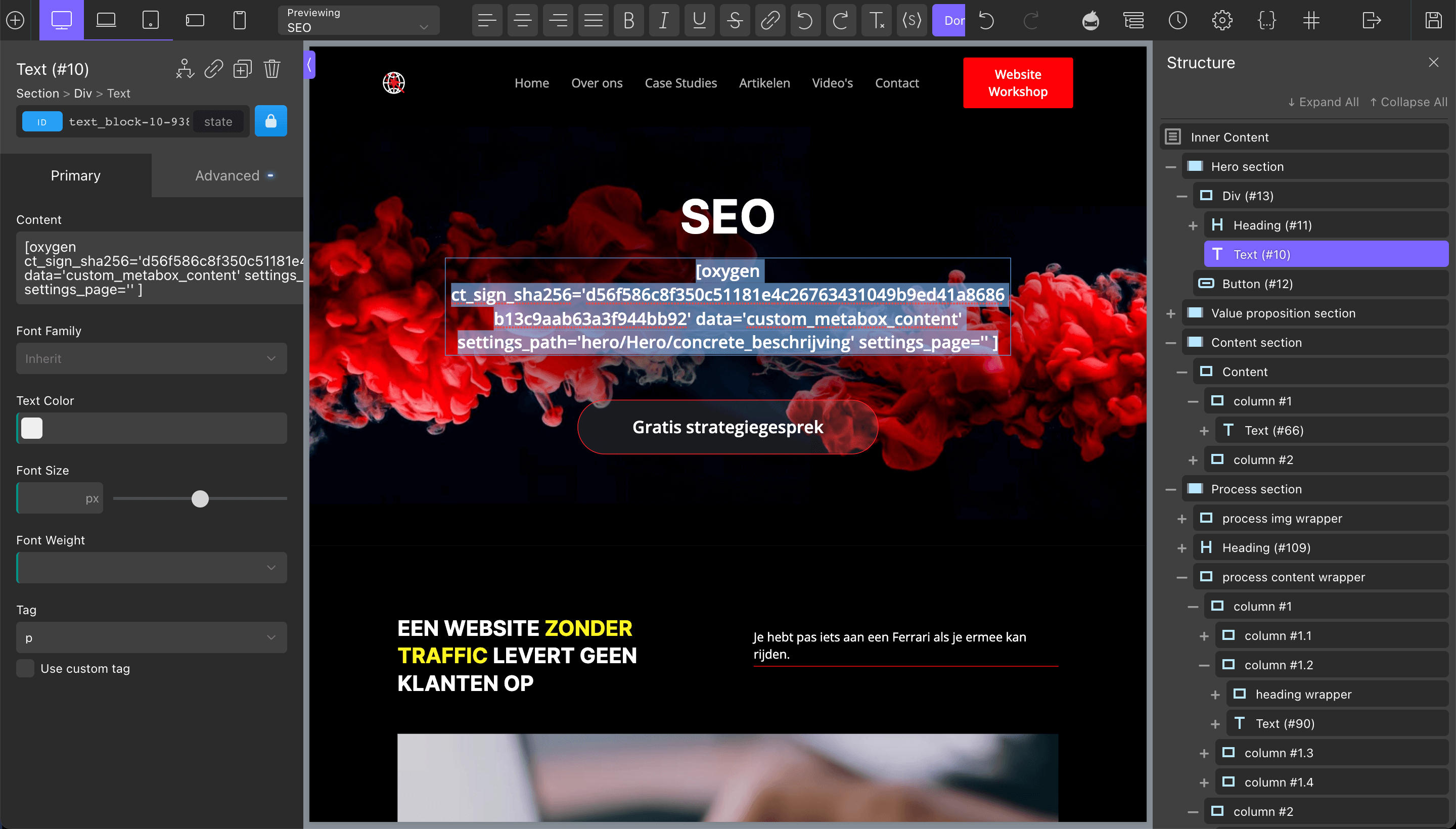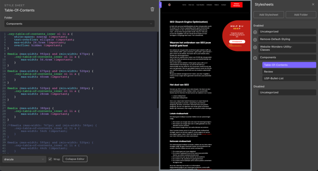 Binnen WordPress, kun je ook werken met page builders. En dan heb ik het niet over de simpele, zware page builders zoals Divi en Elementor. Deze zijn funest voor de kwaliteit van jouw website. Wij werken met de Oxygen Builder. Dit systeem geeft ons de vrijheid om alles volledig op maat te ontwikkelen, binnen het veilige en welbekende ecosysteem van WordPress.